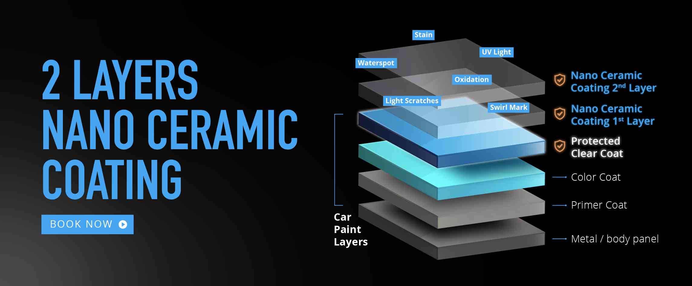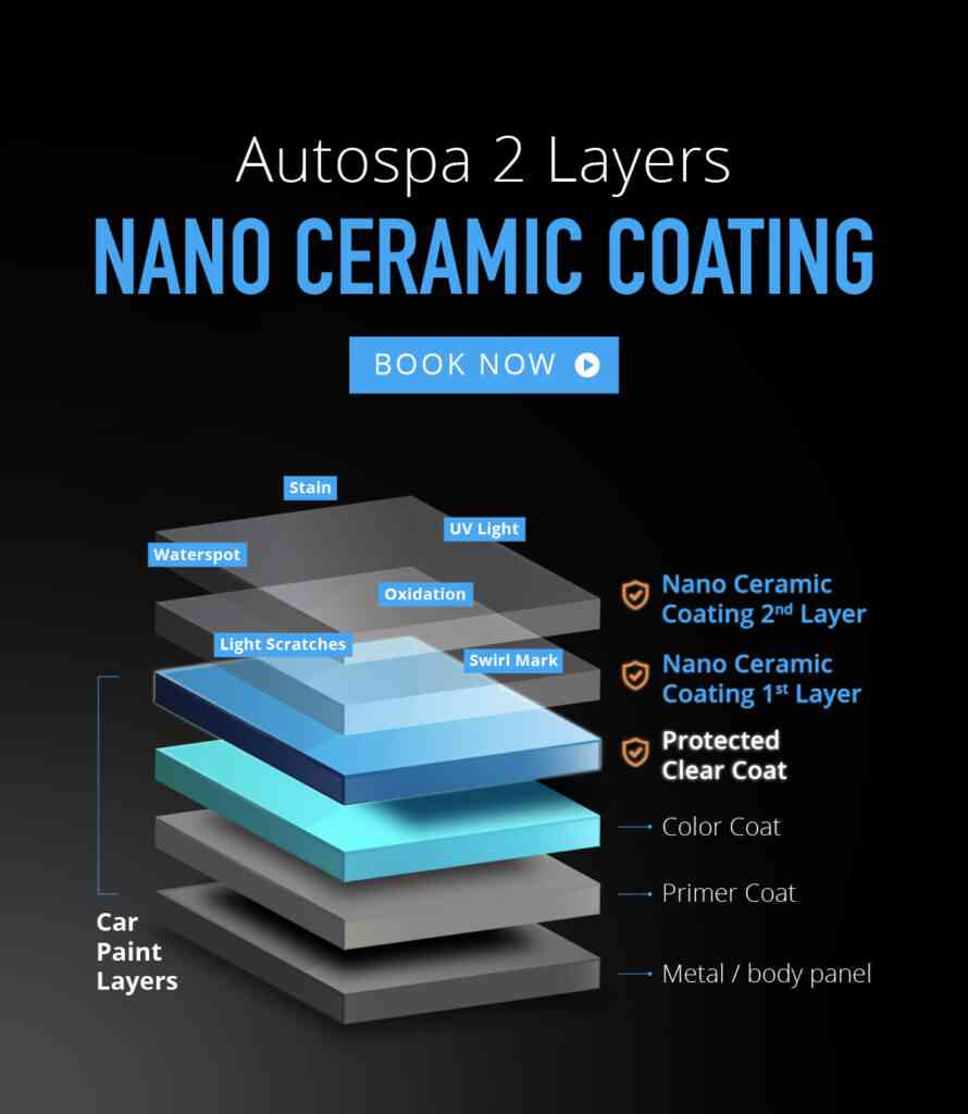 Autospa Nano Ceramic Coating bonds with paint’s clear coat. Ceramic coatings are liquids which, when applied to a vehicle’s paintwork, form a glossy, long-lasting barrier that repels water, contaminants and UV rays. Their purpose is to preserve, protect and enhance the appearance of an unblemished finish.